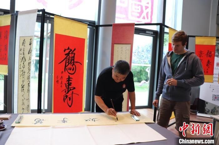 在书法展示区,中国书法家协会会员、书法家李健为现场观众展示宋朝时期由宋徽宗创立的瘦金体书法。一幅幅气韵生动、别具一格的书法作品令人大饱眼福,不少法国观众还在现场学习书写,亲身体验中国书法的艺术魅力。