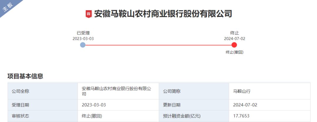 7月2日,深交所公告,日前,马鞍山农商行和保荐人中信证券向深交所提交了《安徽马鞍山农村商业银行股份有限公司关于撤回首次公开发行股票并在主板上市申请文件的申请》等,申请撤回申请文件。根据有关规定,深交所决定终止对安徽马鞍山农村商业银行股份有限公司首次公开发行股票并在主板上市审核。