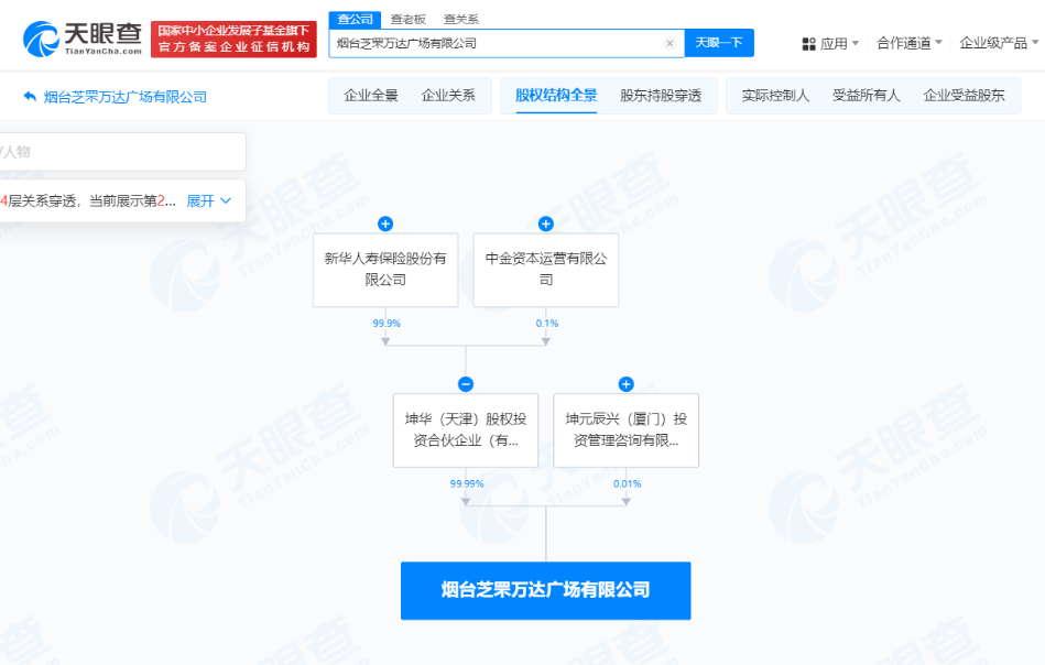 值得一提的是,今年4月,上述两位新增股东已接盘北京万达广场实业有限公司。股权穿透图显示,坤华(天津)股权投资合伙企业(有限合伙)由新华保险、中金资本运营有限公司分别持股99.99%、0.01%,坤元辰兴(厦门)投资管理咨询有限公司2位自然人股东也在中金相关公司任职。