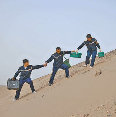 班组成员在翻越沙丘。以上图片均为高鑫摄