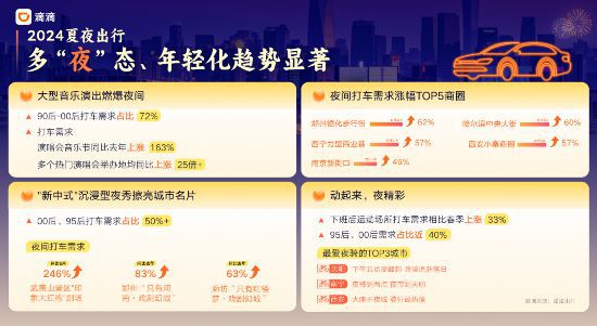“新中式”沉浸型夜秀人气攀升,大型文旅演出不断擦亮城市名片。滴滴出行数据显示,国风夜秀的观众年龄趋于年轻化,00后、95后成主力群体,打车需求占比过半。位于武夷山景区的“印象大红袍”山水实景演出迎来大量游客,带动剧场夜间打车需求环比6月上涨246%。前往郑州“只有河南·戏剧幻城”、廊坊“只有红楼梦·戏剧幻城”的夜间滴滴打车需求同比去年涨幅分别达83%、63%。