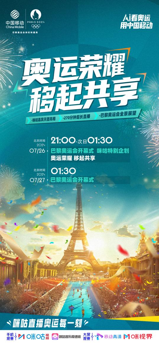 顶级体育盛宴一触即发,7月26日21:00,锁定《奥运荣耀 移起共享》巴黎奥运会开幕式咪咕特别企划,奥运精彩抢先看!广大观众可登录咪咕视频、移动高清、咪视界观看全量全场次赛事直播,咪咕音乐极速版也将带来精彩赛事内容。AI 看奥运,用中国移动,随着奥运会的开幕,中国移动也将以科技创新为体育打开更大的想象空间,让世界看到中国速度、中国力量,为中国体育健儿加油助威。