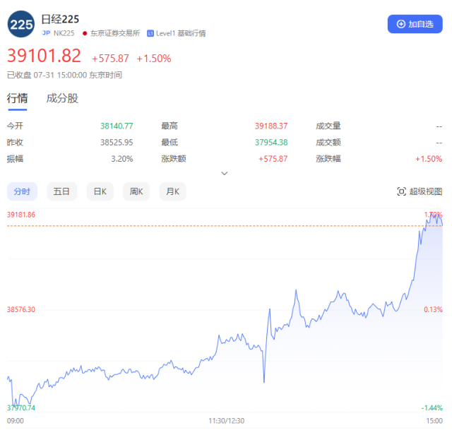 突发!日本央行加息!日经225指数尾盘直线拉升