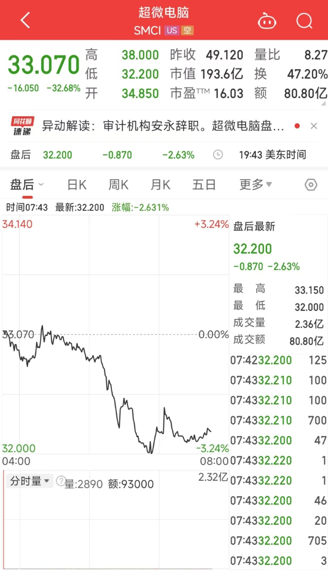 【大河财立方消息】10月31日消息,美股AI巨头超微电脑遭遇“黑天鹅”。当地时间10月30日,超微电脑股价暴跌超30%,收跌32.68%。消息面上,安永会计师事务所辞去了超微电脑的审计职务,理由是对公司治理和透明度表示担忧。