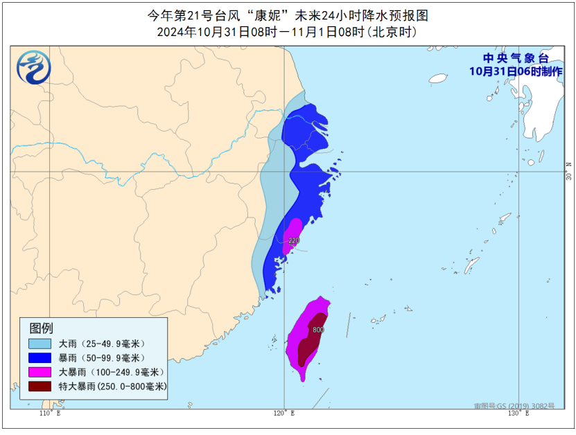 黄美金表示,福建已经出现大风,最大风力可达9级至11级,阵风12级至14级。降雨方面,今天至11月1日,福建中北部沿海地区的宁德、福州、平潭、莆田和南平的东部部分有暴雨到大暴雨,2日开始风雨影响减弱,最大降水量主要集中在今天,24小时累计雨量可达60毫米至150毫米,局部最大可达220毫米。
