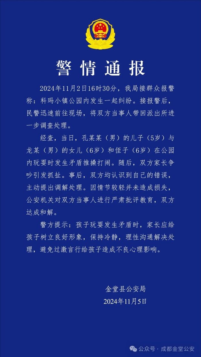 央视网消息:据“成都金堂公安”微信公众号消息,11月5日,成都金堂县公安局发布警情通报,11月2日16时30分,金堂公安局接群众报警称:科玛小镇公园内发生一起纠纷。接报警后,民警迅速前往现场,将双方当事人带回派出所进一步调查处理。