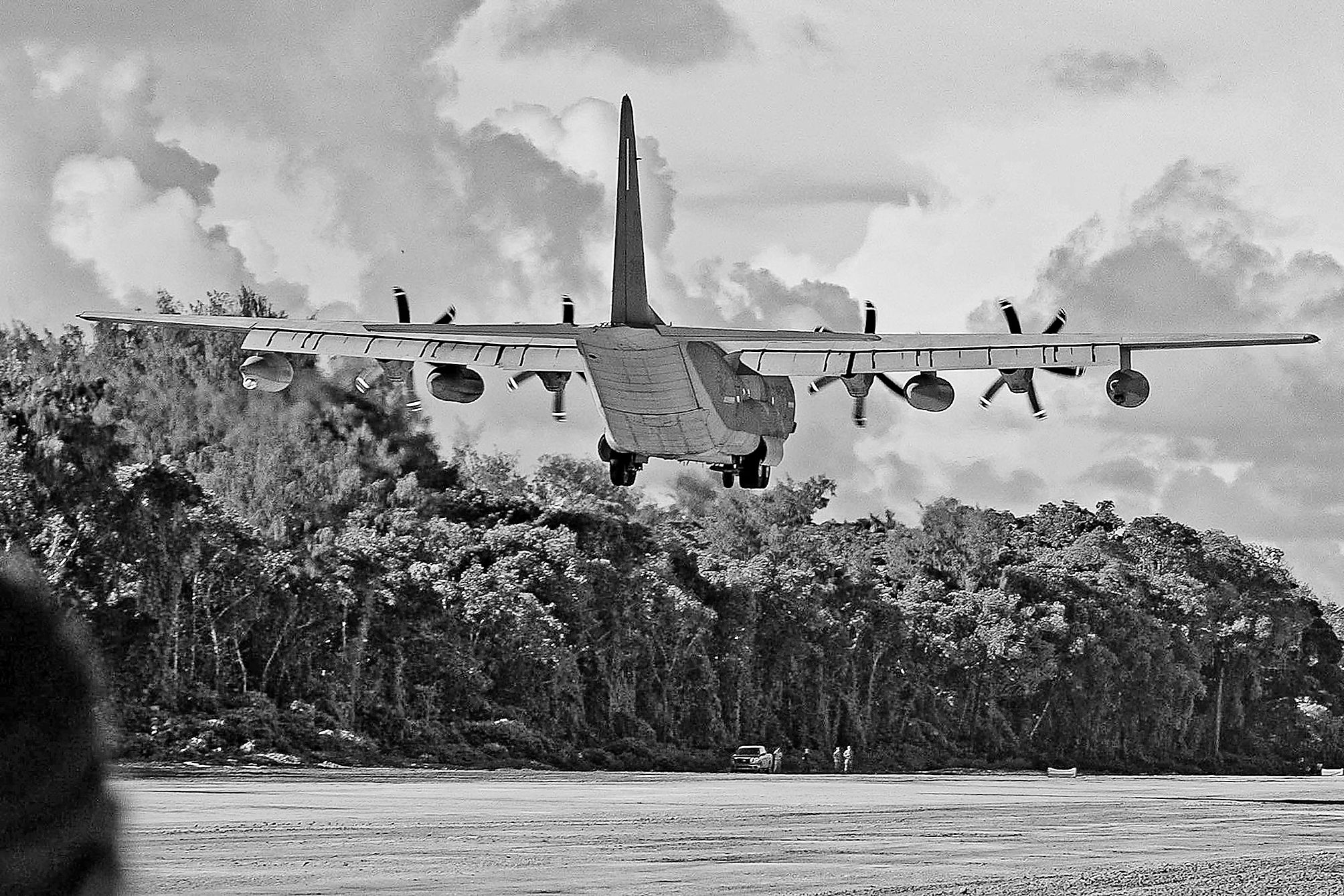 美国海军陆战队一架KC-130J飞机降落在帕劳的贝里琉岛简易机场。
