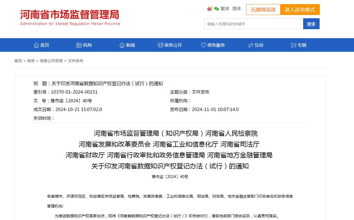 近日,河南省市场监督管理局、河南省人民检察院等8部门联合印发《河南省数据知识产权登记办法(试行)》(以下简称《办法》),旨在通过数据知识产权登记,清晰地界定数据的所有权,进一步规范河南省数据知识产权登记行为,促进数字经济发展。