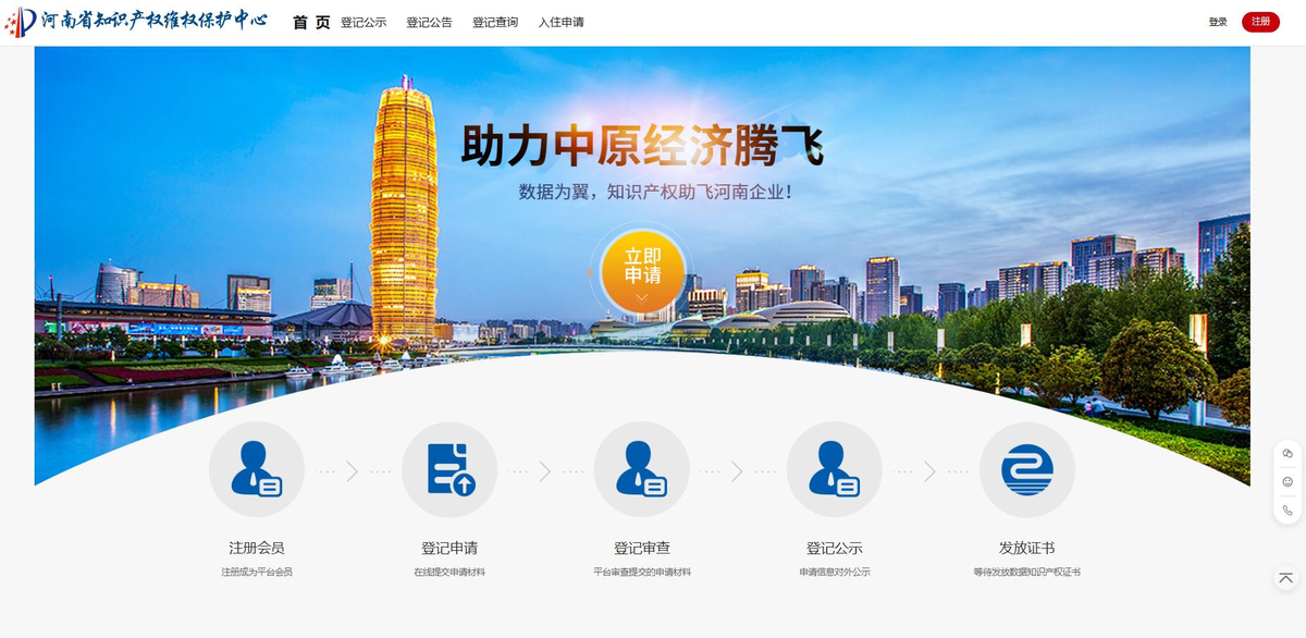 第一步:访问河南省知识产权维护保护中心官方网站(http://122.114.204.35:18080/),注册后登录至系统界面。