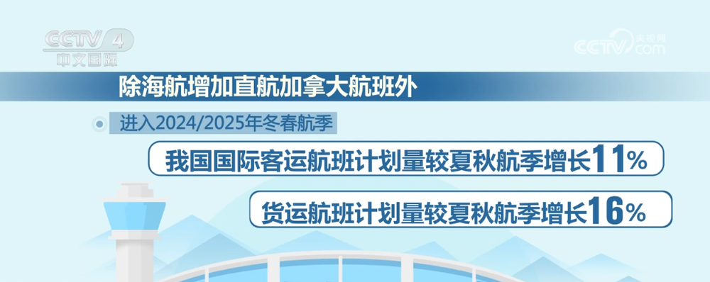 除了海航增加直航加拿大航班外,进入2024/2025年冬春航季,我国国际客运航班计划量较夏秋航季增长11%,货运航班计划量较夏秋航季增长16%,至拉美、非洲、北美航班计划量明显增加,中亚、东南亚、日韩、欧洲等传统市场也稳中有进。