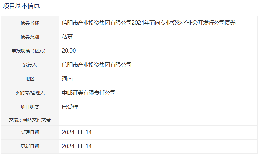 【大河财立方消息】11月15日消息,信阳市产业投资集团有限公司2024年面向专业投资者非公开发行公司债券项目,已获深交所受理。