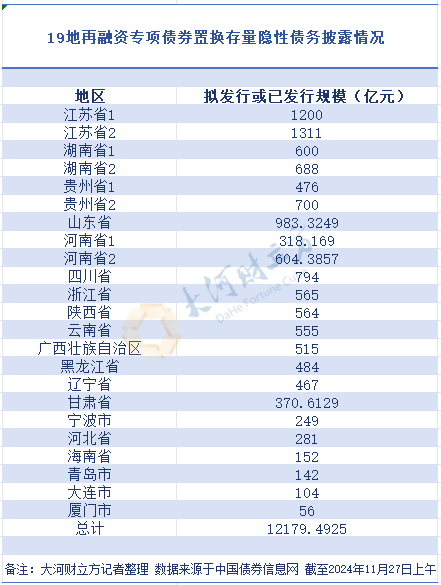 6万亿化债方案公布以来,新一轮存量隐性债务置换工作正式启动。大河财立方记者据中国债券信息网披露数据统计,全国19个地区披露的用于置换存量隐性债务再融资专项债券总额为12179.4925亿元。