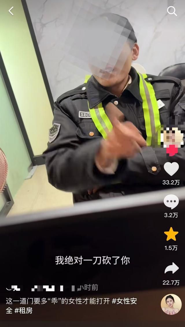 12月9日晚,租住在成都朗御大厦的百万粉丝女博主圆圆(化名),通过其社交账号控诉,当天凌晨因为没带身份证件被拒进入大厦。她和保安发生言语冲突,保安发出过激言论:“要是我到50岁,我绝对一刀砍了你。”截至目前,该视频点赞量破34万,转发量破23万,评论量达3.5万。