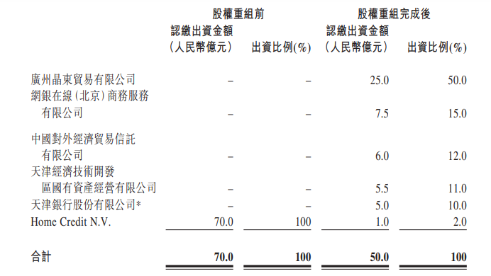 股权重组完成后,广州晶东贸易有限公司、网银在线(北京)商务服务有限公司合计出资32.5亿元,持股65%;外贸信托、天津经济技术开发区国有资产经营有限公司、天津银行分别出资6亿元、5.5亿元、5亿元,出资比例为12%、11%、10%。对应地,原股东捷信集团的出资比例降至2%。