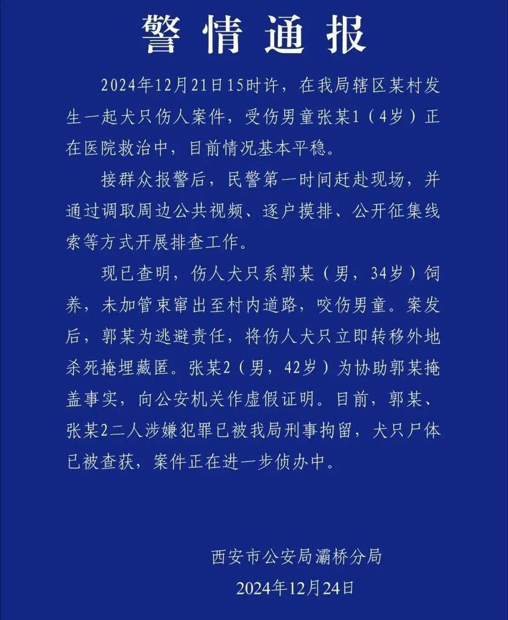 2024年12月21日15时许,在该局辖区某村发生一起犬只伤人案件,受伤男童张某1(4岁)正在医院救治中,目前情况基本平稳。