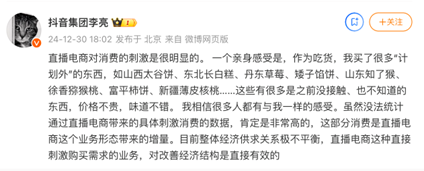 央广网北京12月31日消息(记者 郭彦伟 实习记者 刘之童)直播电商已成为消费领域的新引擎,对拉动内需、促进经济增长发挥着关键作用。日前,抖音副总裁李亮在社交平台发文,肯定直播电商在刺激消费和改善经济结构方面的意义。
