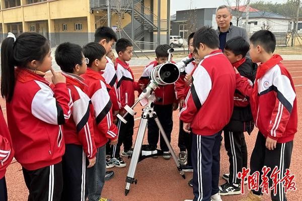2024年11月12日,在安新县老河头学校,跟随张春华的讲解,该校初中物理教师石小东逐渐掌握和熟悉了天文望远镜的操作。在望远镜旁,是排队等待观测的学生们,每个人都兴致勃勃,一边认真聆听操作要领,一边紧紧盯着望远镜。