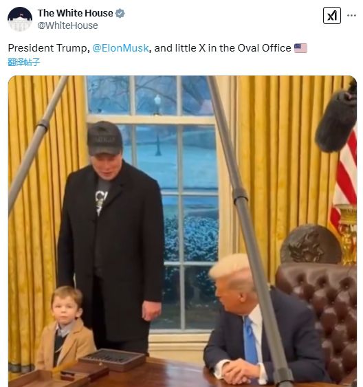 当天,白宫在社交媒体上分享了一段特朗普、马斯克,以及马斯克的小儿子在椭圆形办公室的视频。