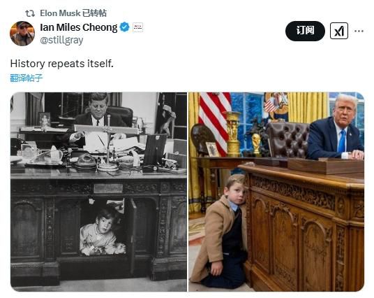 其中,右边的照片,是2025年2月11日,马斯克的小儿子和特朗普在白宫椭圆形办公室的同框照;左边的照片,则是1962年5月25日,美国前总统肯尼迪在椭圆形办公室工作时,小约翰·肯尼迪在“坚毅桌”下玩耍的画面。
