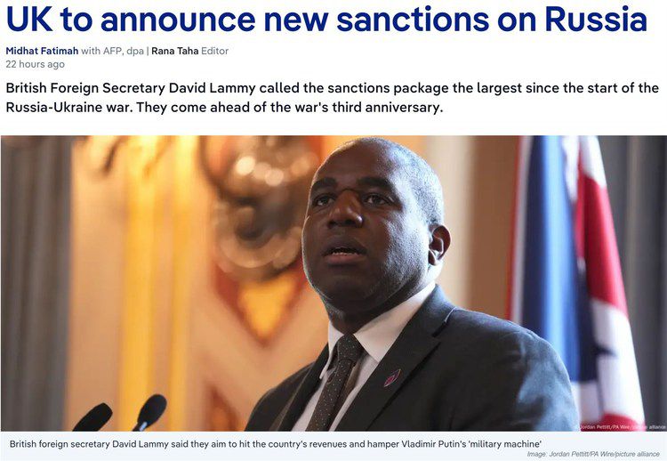 同一天,英国外交大臣戴维·拉米表示,英国将于24日宣布自乌克兰危机全面升级以来,对俄罗斯实施的最大规模的一揽子制裁措施,旨在继续对俄施压,以展现出对乌克兰的支持。