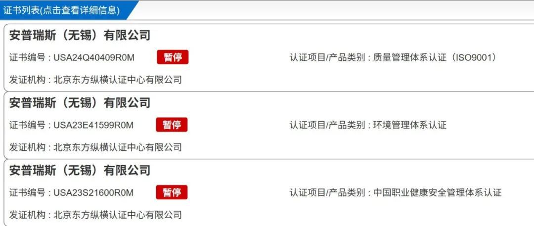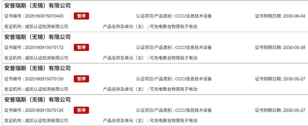 据悉,安普瑞斯由美国安普瑞斯与无锡产业发展集团合资成立,产品广泛应用于移动电源、智能手机、笔记本电脑及无人机等领域。记者查询全国认证认可信息公共服务平台显示,该公司所有的电池/电芯3C证书均被暂停或撤销,暂停或撤销的时间大多集中在6月。