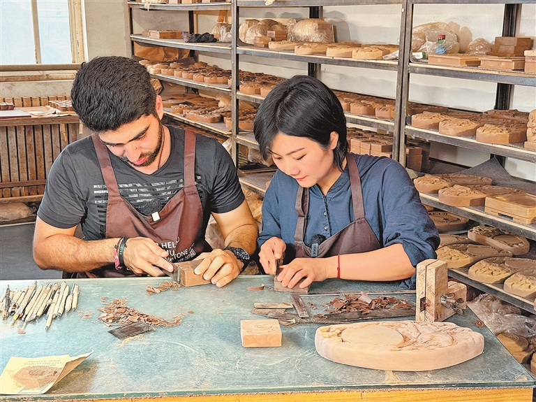游晓晓在教外国学员做澄泥砚。 本版图片除署名外均为受访者供图