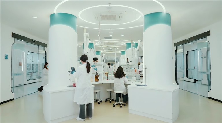 在实验室,研究员用滴管萃取道地药材地黄中的水苏糖;推开隔壁车间门,膜布裁切机的声浪便扑面而来;评价中心的屏幕上,肌肤与产品的“对话”正化为跳动数据。不同形态的面膜、流动的牡丹囊泡液、工作人员手中如艺术品般被打磨的新品……这里汇聚了从研发、生产到测试的完整链条。