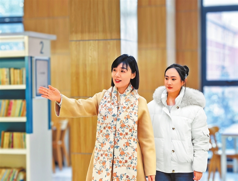 夏彩玲在图书馆里引导学生学习技能。