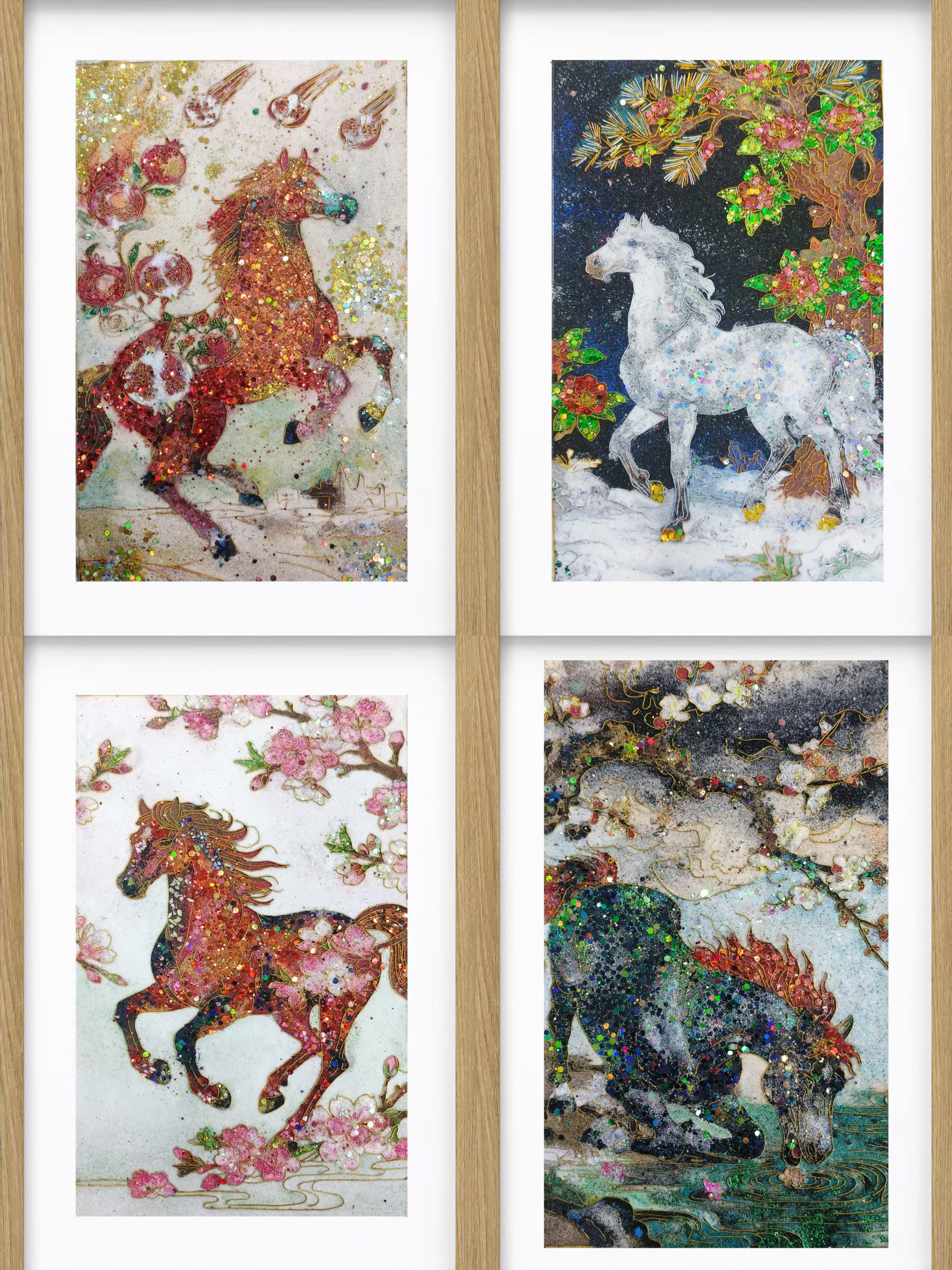 “这是《十二月花令与中国名马》系列中的一幅。”她展示着另一幅作品,“正月梅花与赤兔马。我们用‘螺钿’工艺——也就是镶嵌打磨后的贝壳薄片,来表现梅花花瓣的莹润光泽;用‘岩彩’(一种源自中国重彩画的矿物颜料)的颗粒感来呈现马匹肌肉的质感。很多人误以为岩彩是日本工艺,其实它的根在中国唐宋。我们做的,也是一次传统的寻根与活化。”