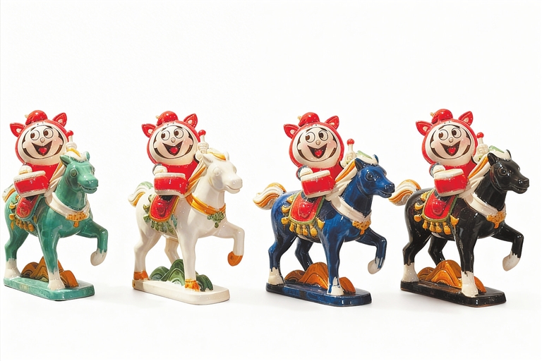 “这是专为马年创作的《骏马迎春》系列。猴同‘侯’,加上官帽,本就是‘封侯加官’。今年我们给它添了一匹色彩鲜亮的小马作冠,”非遗代表性传承人魏田军一边灵巧地操控着手中的线偶,一边解释,“将传统戏曲人物面具改为马,既守住了猴加官技艺的本真,又契合‘马上封侯’的祝福,讨的就是福禄双全、步步高升的好彩头。”