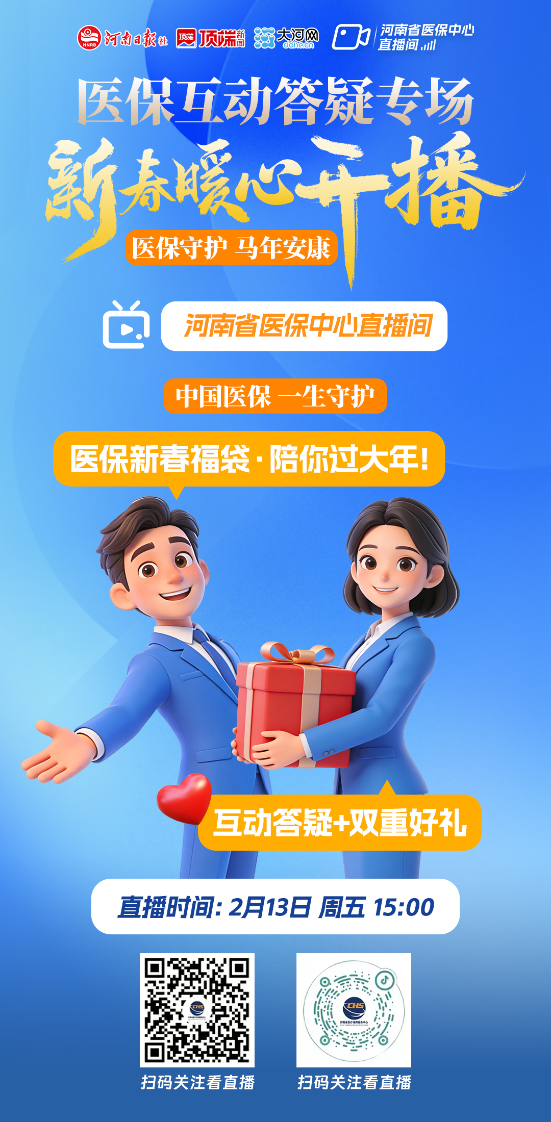 大河网讯 2月13日15时,河南省医保中心直播间将准时开播!“小保”主播为网友解答医保相关热点问题。直播过程中有惊喜好礼相送,欢迎大家观看互动!