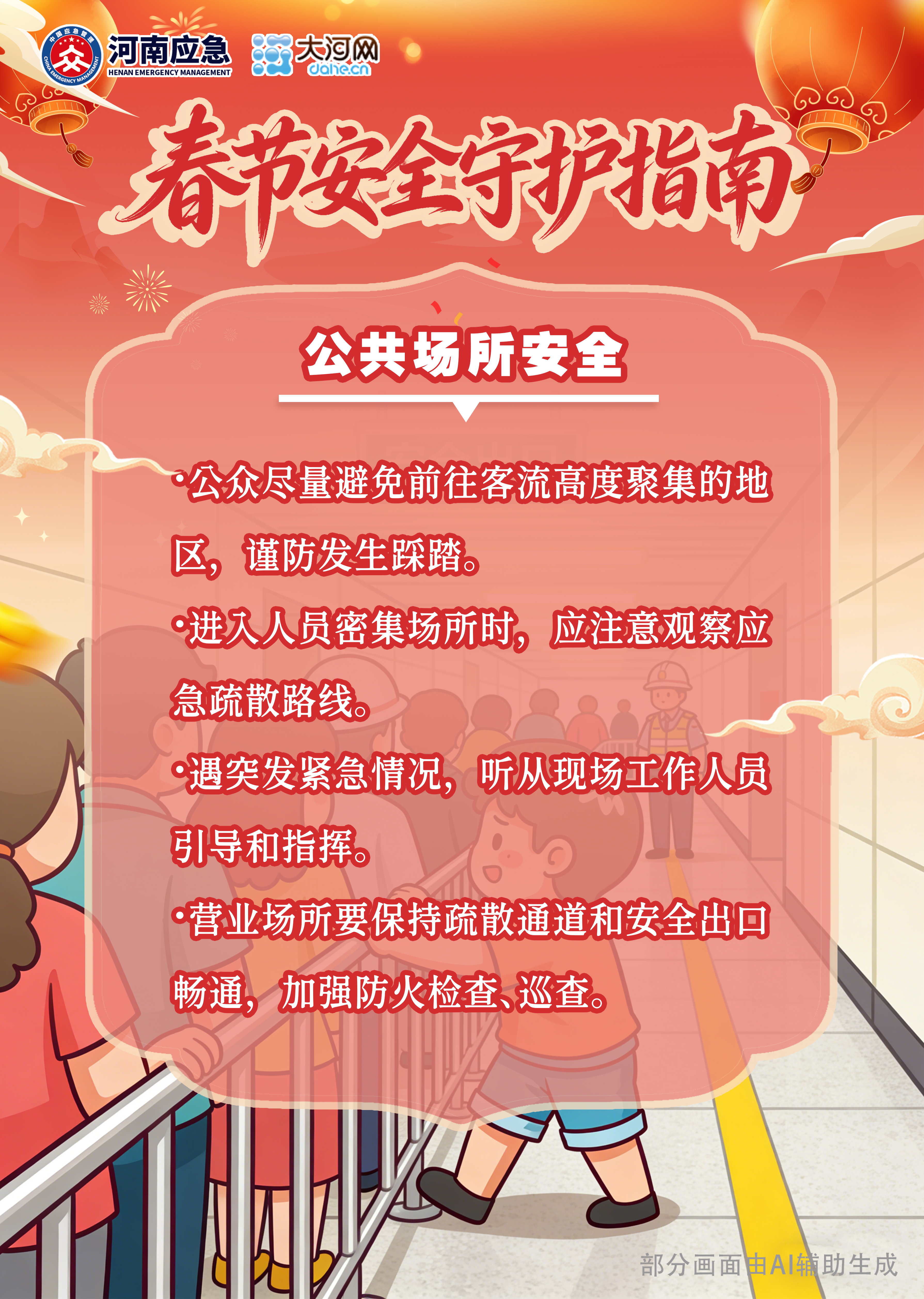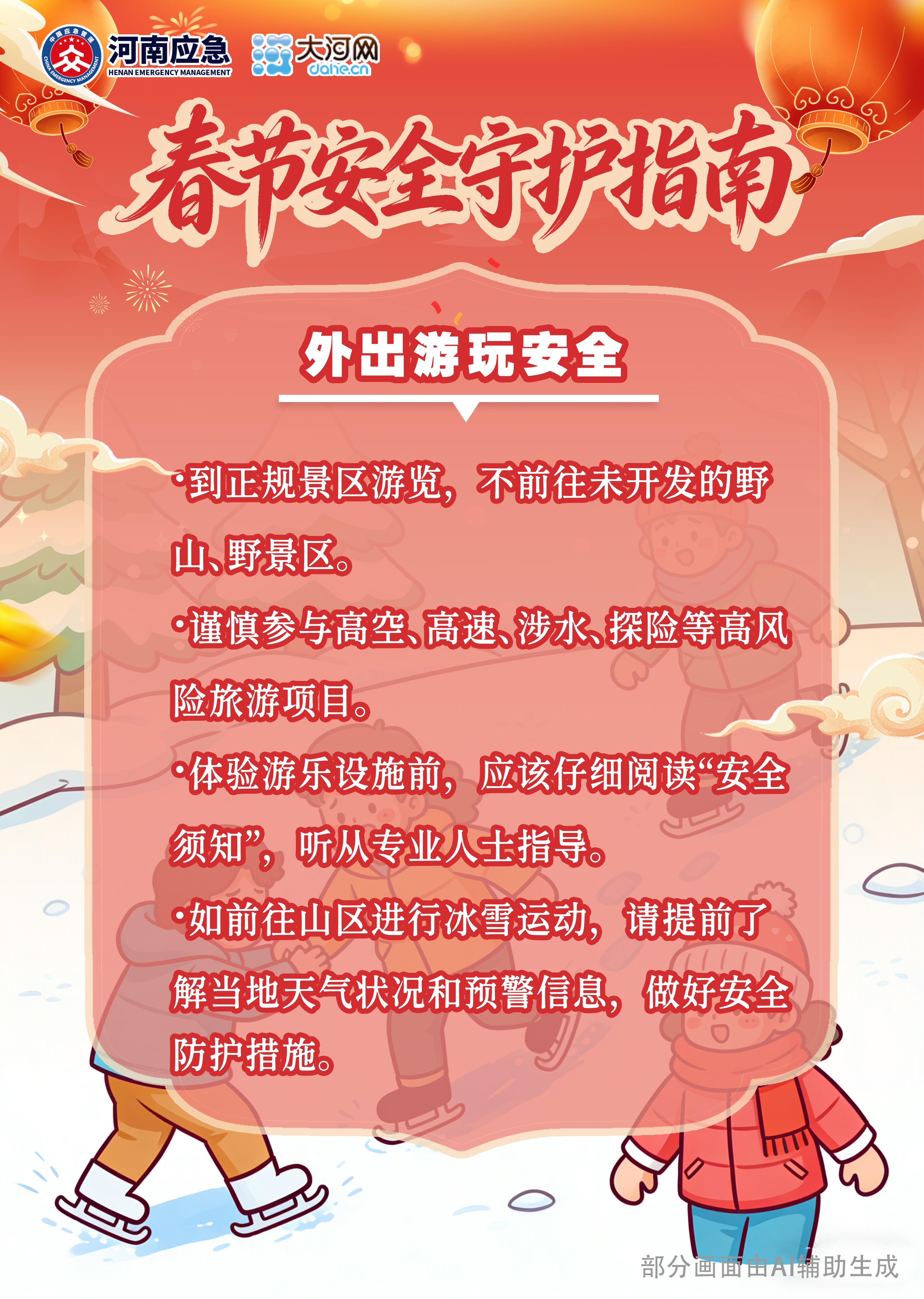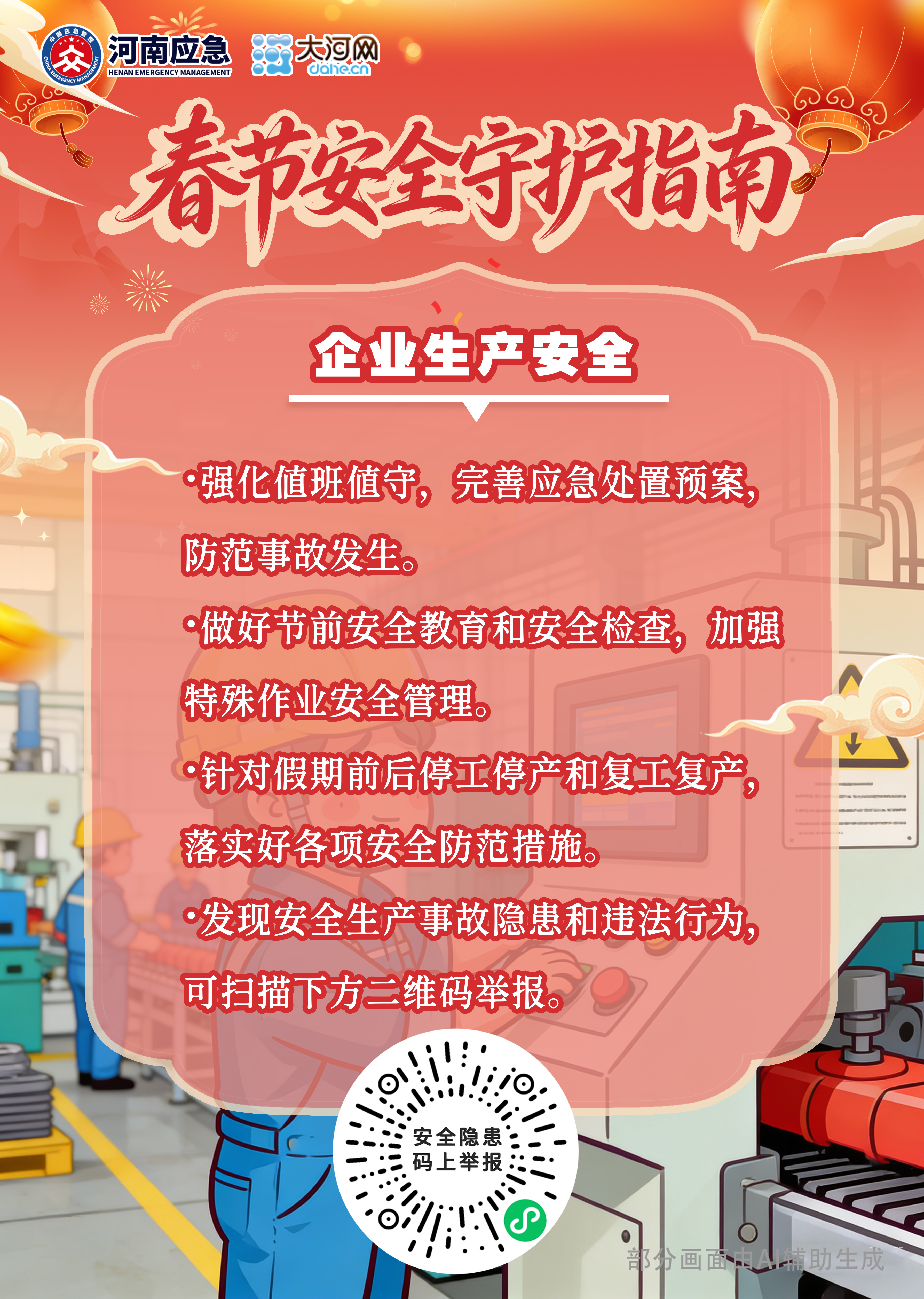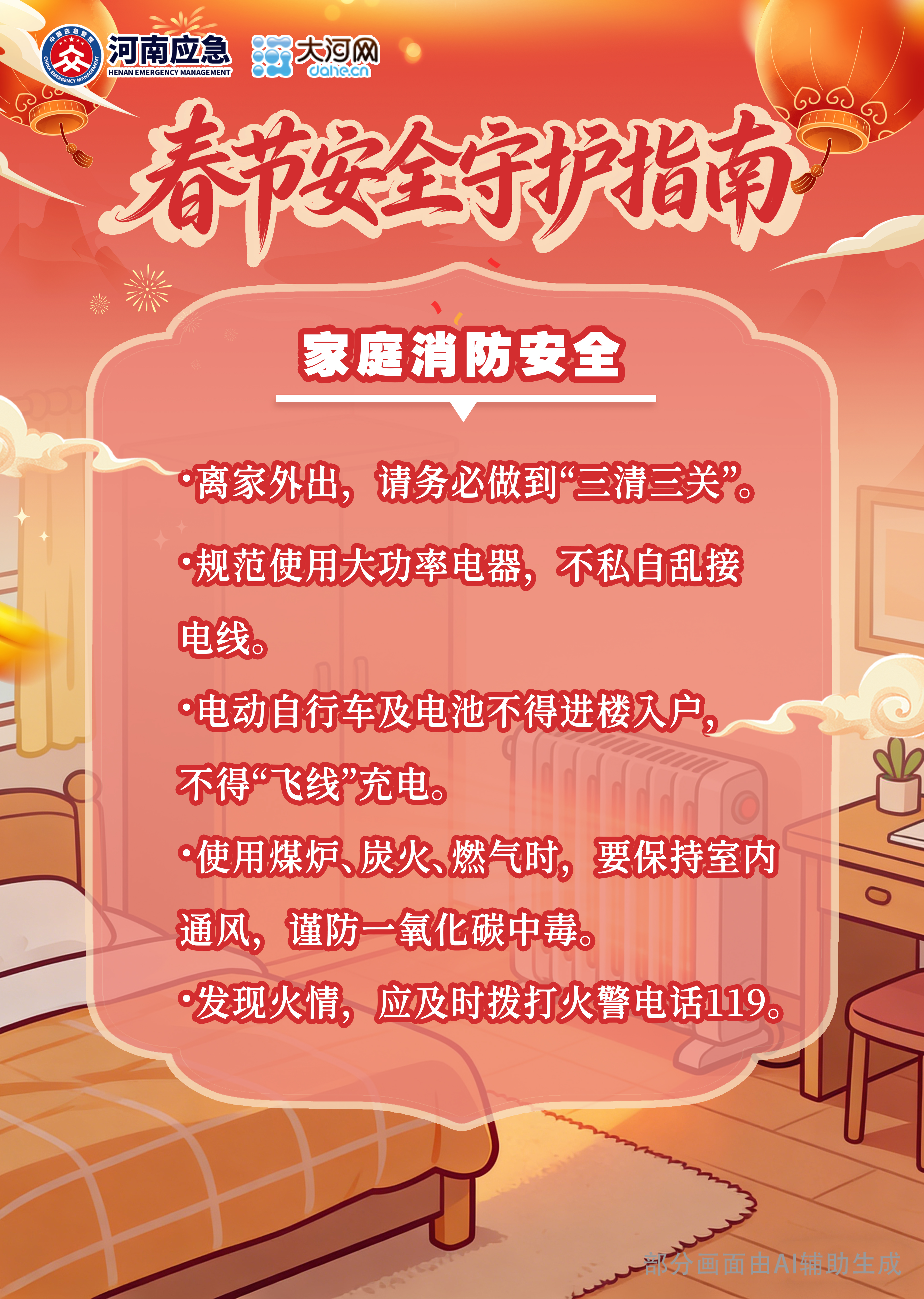 大河网讯 年味儿越来越浓,安全更要时刻相伴!春节假期,自驾出行、客货运输迎来高峰,灯会、庙会、庆典等大型活动增多,宾馆、饭店、商超等场所人员密集,各类安全风险叠加。河南省应急管理厅发布温馨提示,提醒公众春节假期期间提高安全防范意识,平平安安迎新春、欢欢喜喜过大年。(孟媛)