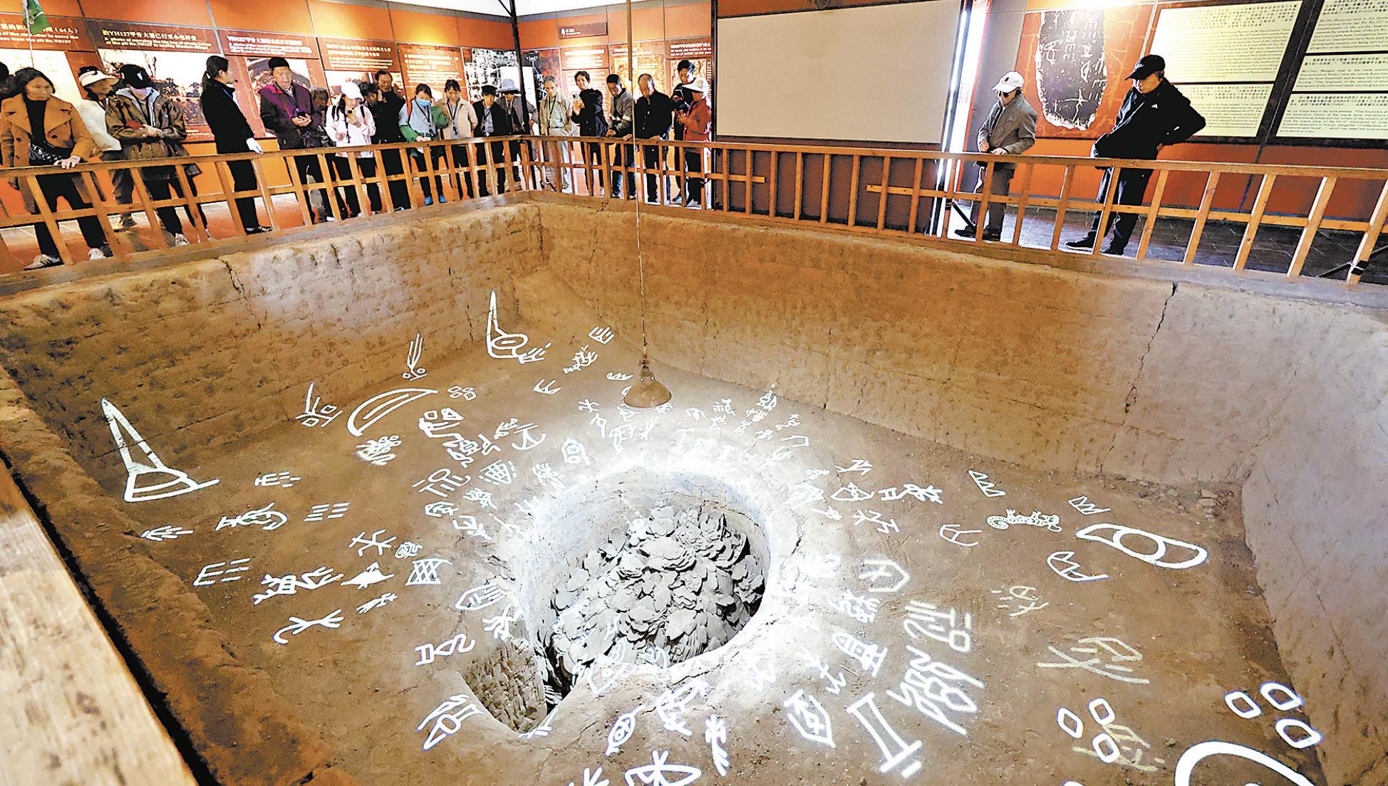游客参观安阳殷墟宫殿宗庙遗址甲骨窖穴,了解甲骨文的起源。(资料图)