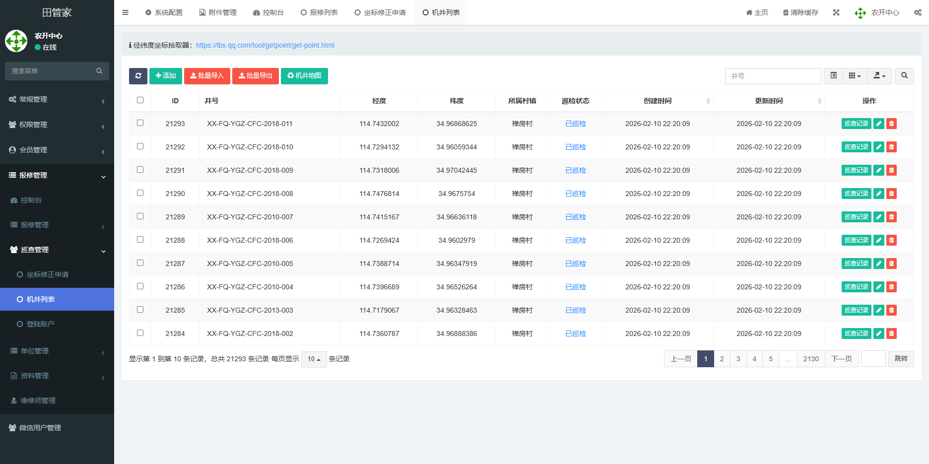 为确保管护形成闭环,小程序设置“最近报修”功能,农户可实时掌握维修进度,处置结果一目了然。维修人员通过专属模块接收工单,完成处置后在线录入报告,实现问题“早发现、快处置”。针对机井数量多、人工巡检难的痛点,“巡检管理”功能为管护人员提供数字化工具:登录后可查看所负责区域的所有机井点位,系统以“红黄绿”三色标注打卡状态,未巡检点位清晰可见。管护人员到达现场后,上传照片、确认部件状态并完成打卡,实现巡检全程可追溯,从源头保障春灌设施稳定运行。