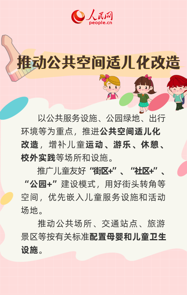 儿童友好建设是建设生育友好型社会,推动各类资金资源“投资于人”、优先服务于儿童的重要路径。近日,国家发展改革委、国务院妇儿工委办公室联合印发《关于在全社会推进儿童友好建设的意见》。这份文件提出了哪些政策举措?将给有娃家庭带来哪些利好?一起来看。
