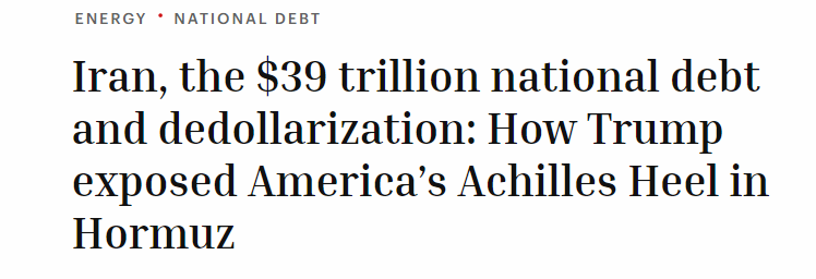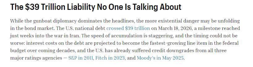 2026年3月18日,美国的国债规模首次突破39万亿美元大关,而这恰恰出现在对伊朗发动军事行动的几周之后。债务积累的速度令人震惊,而且时机也极为不利:预计未来几十年,债务利息成本将成为美国联邦预算中增长最快的项目,三大评级机构,标准普尔于 2011 年、惠誉于 2023 年、穆迪于 2025 年 5 月分别下调了美国的信用评级。