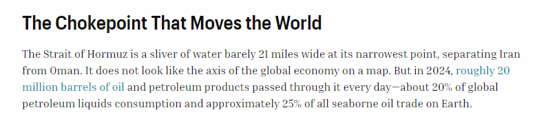 文章认为,霍尔木兹海峡是“石油美元”体系最关键的节点所在。作为全球能源运输的“咽喉要道”,霍尔木兹海峡承担了约20%的全球石油和近五分之一的液化天然气(LNG)贸易运输,对中东地区国家出口能源产品至关重要。