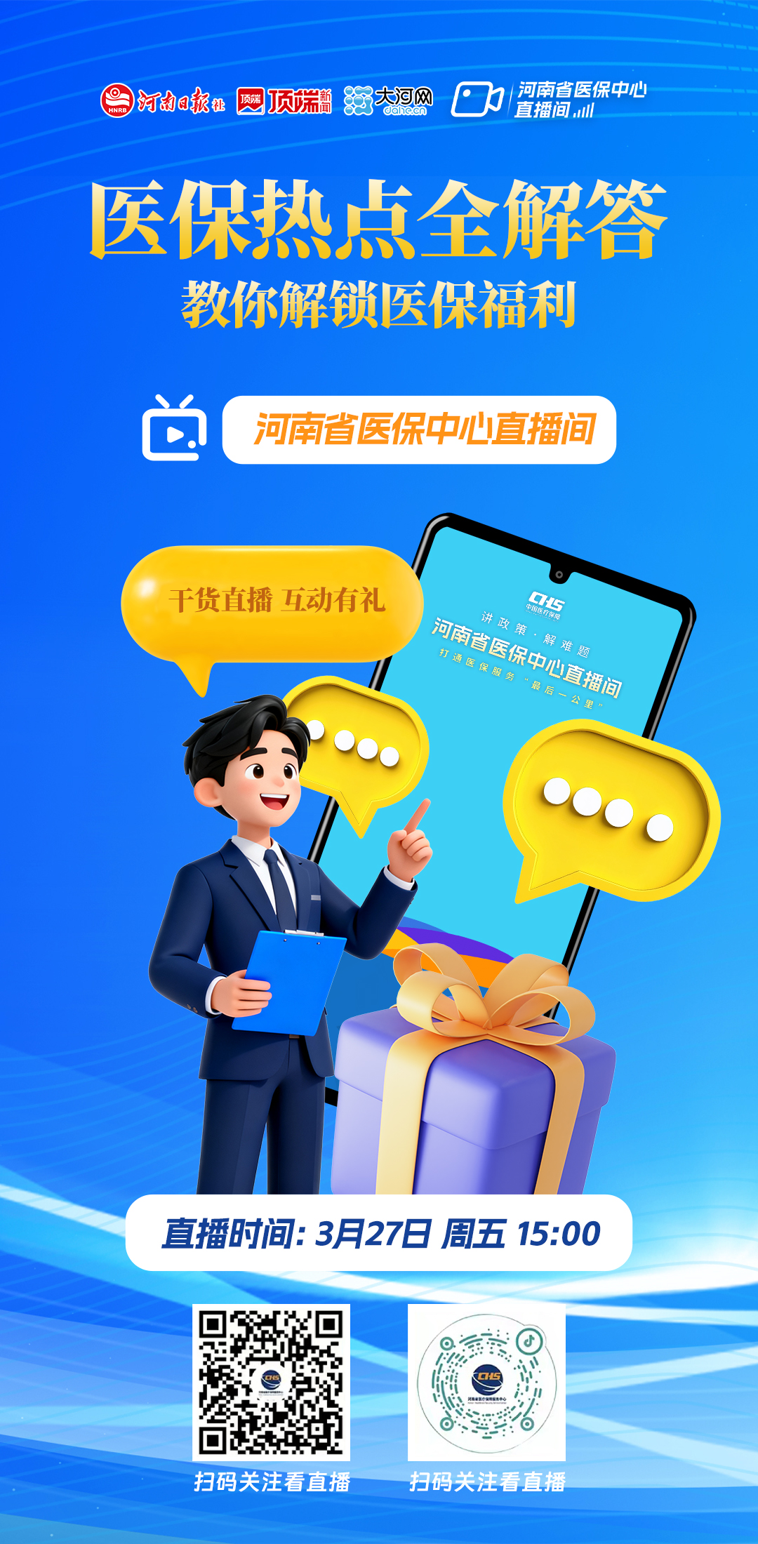 河南省医保中心将通过河南省医疗保障服务视频号、河南省医保中心抖音号、大河网全媒体等平台定期进行直播,如果大家有医保相关问题,欢迎在直播间通过公屏参与互动,主播将实时为大家解答。(孙振恒)