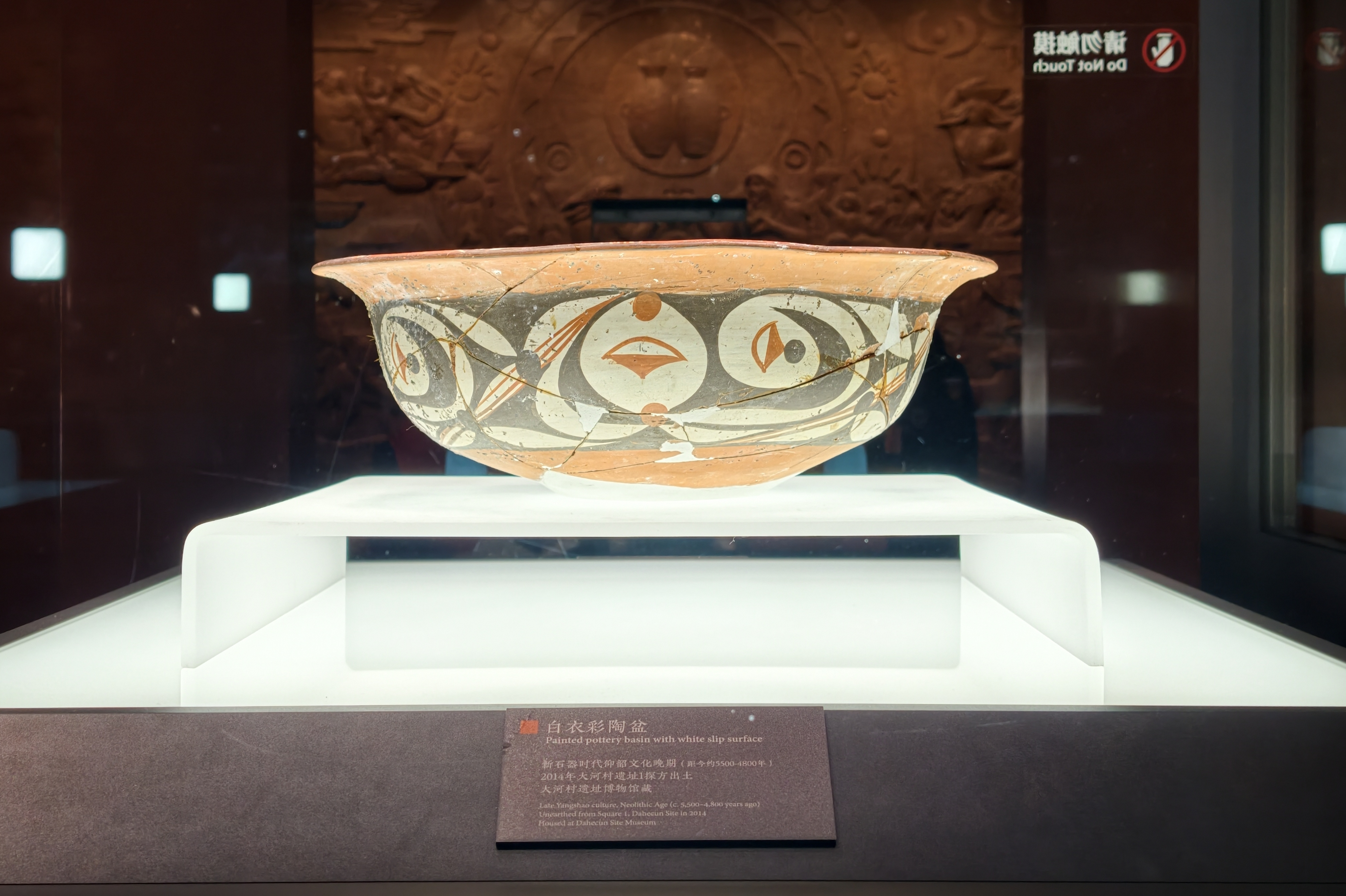 陶片形态各异,上面的纹饰,有太阳纹,有月亮纹,有星纹,有点纹,有几何纹饰,有鸟纹鱼纹等动物纹饰,也有白衣彩陶、双连壶等文物上面的复合与特殊纹饰。有采访团的记者说,他们去过很多博物馆,但像大河村遗址博物馆这样,把残破的陶片当宝贝的还真不多见。