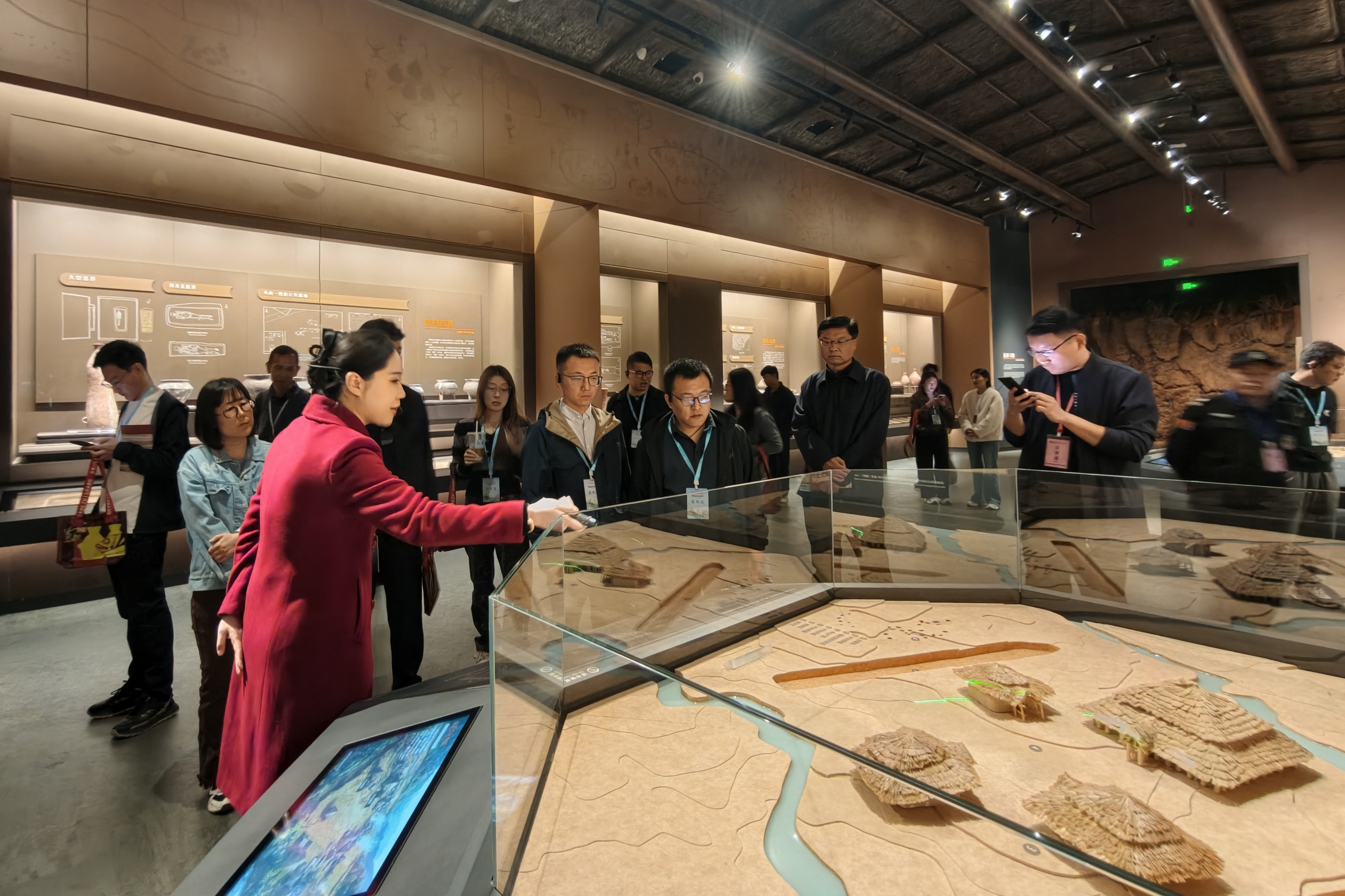 采风团成员听取博物馆工作人员讲解大河村的建筑布局。