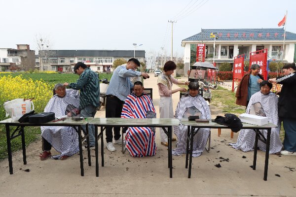 当天一早,志愿者们就忙活开了。理发现场,来自学校理发店的师傅耐心询问每位老人的需求,一边剪发一边唠家常。推剪声嗡嗡作响,碎发飘落间,老人们原本凌乱的头发变得整齐利落。“平时去镇上理发不方便,你们来了真是太好了!”刚理完发的李大娘对着镜子左看右看,笑得合不拢嘴。一上午,三十余位老人陆续理了发。