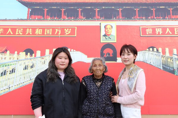 理发完毕,老人们来到村部大院,一面以天安门城楼为背景的巨型喷绘墙赫然矗立,红墙金瓦、红旗飘扬。很多老人一辈子没出过远门,去天安门看看是他们心底的念想。如今,这个念想在志愿者的镜头里成了真。