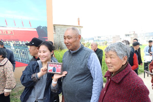 这是信阳师范大学明德书院“学雷锋·文明实践我行动”主题活动中的一幕。师生们把天安门城楼背景板“搬”进村里,为老人们送去了一份特别的礼物。