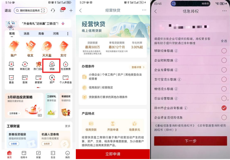 工商银行郑州分行工作人员提示,即日起,郑州市符合条件的小微企业可通过工商银行手机银行APP,进入“普惠金融”专区,选择【贷款】,进入【贷款】页面,选择【普惠贷】并点击【经营快贷】,信息授权页勾选郑州市企业政务数据授权,即可在线申请“郑信e贷”,也可前往郑州分行各营业网点咨询办理。(本贷款产品为线上专属产品,仅可通过工商银行手机银行渠道申请,不接受任何第三方助贷机构或个人代理申请。)