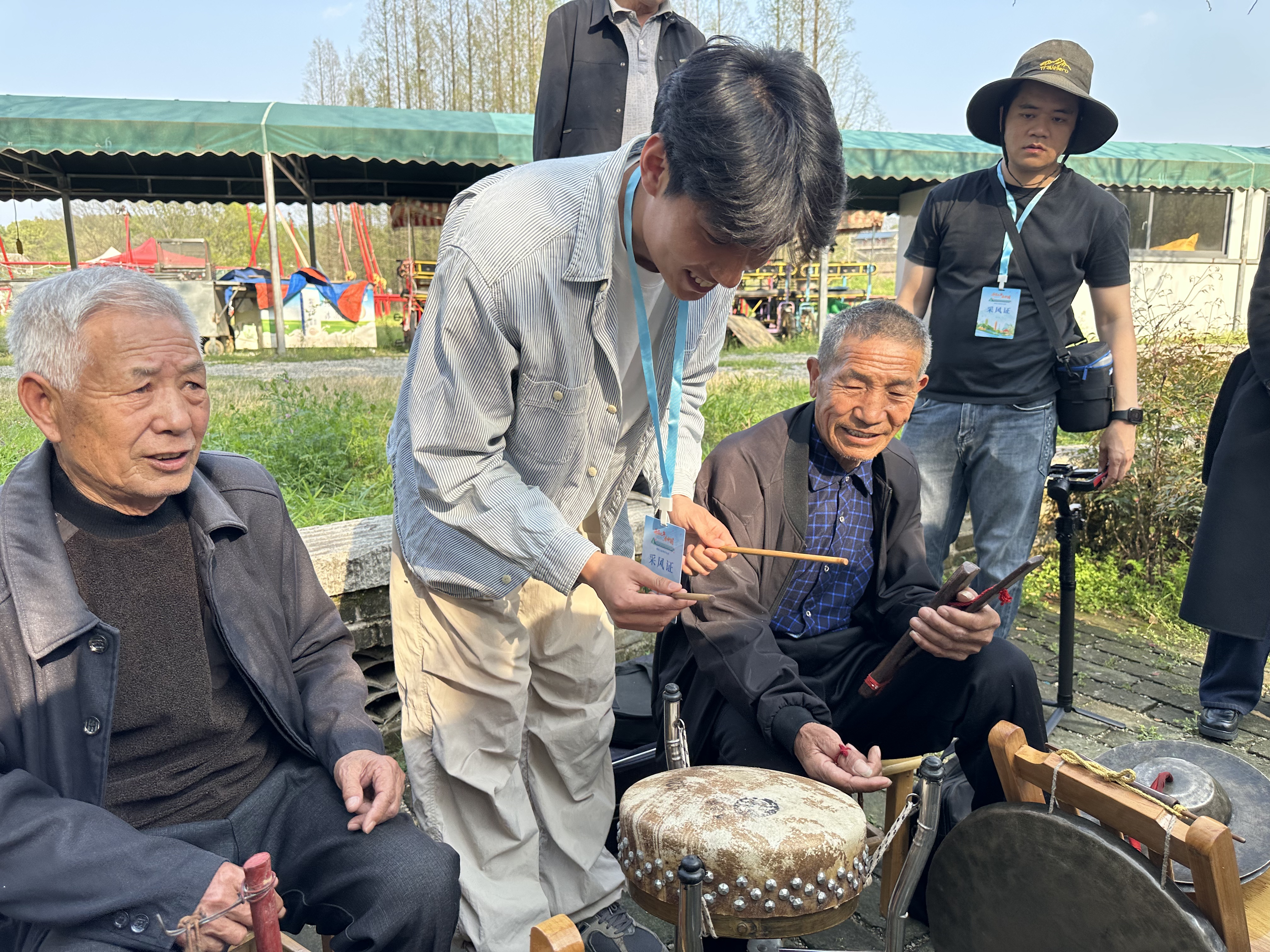 白日里阳光明亮,村里却支起了皮影戏的幕布,三位老人站在后台,指尖翻飞、唱腔悠扬,全然不顾白日光线让幕布上的皮影显得有些模糊,一丝不苟地演绎着。