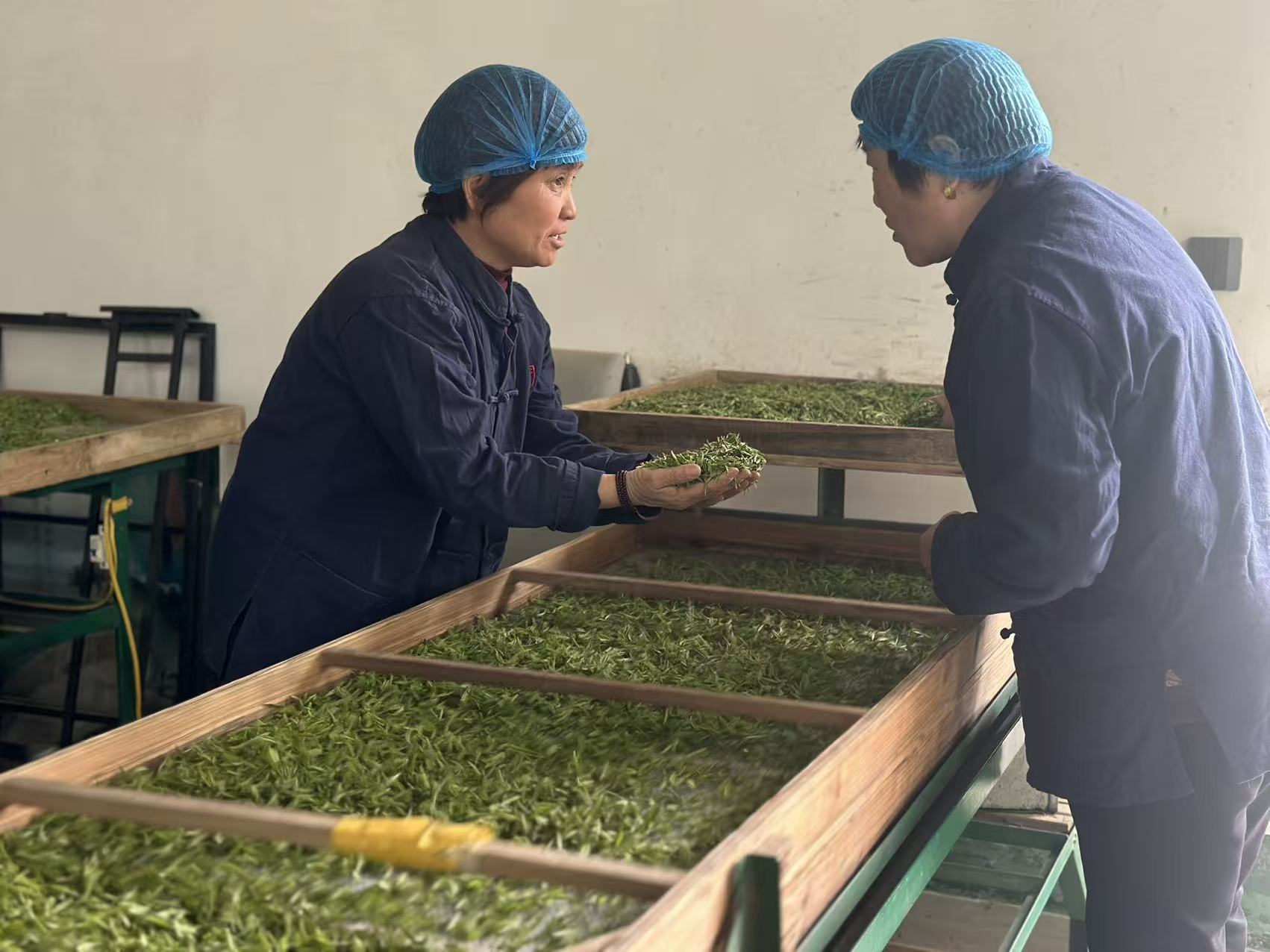 她指着门框上“周肖同茗”的牌匾向记者娓娓道来:“我姥爷姓周,父亲姓肖。姥爷是炒茶老手,父亲是他徒弟。师父在前、徒弟在后,‘周肖同茗’就是两辈人一起做茶。在我们这儿,像这样世代制茶的家庭还有很多,大多是父辈祖辈传下来,子辈孙辈接着干。”