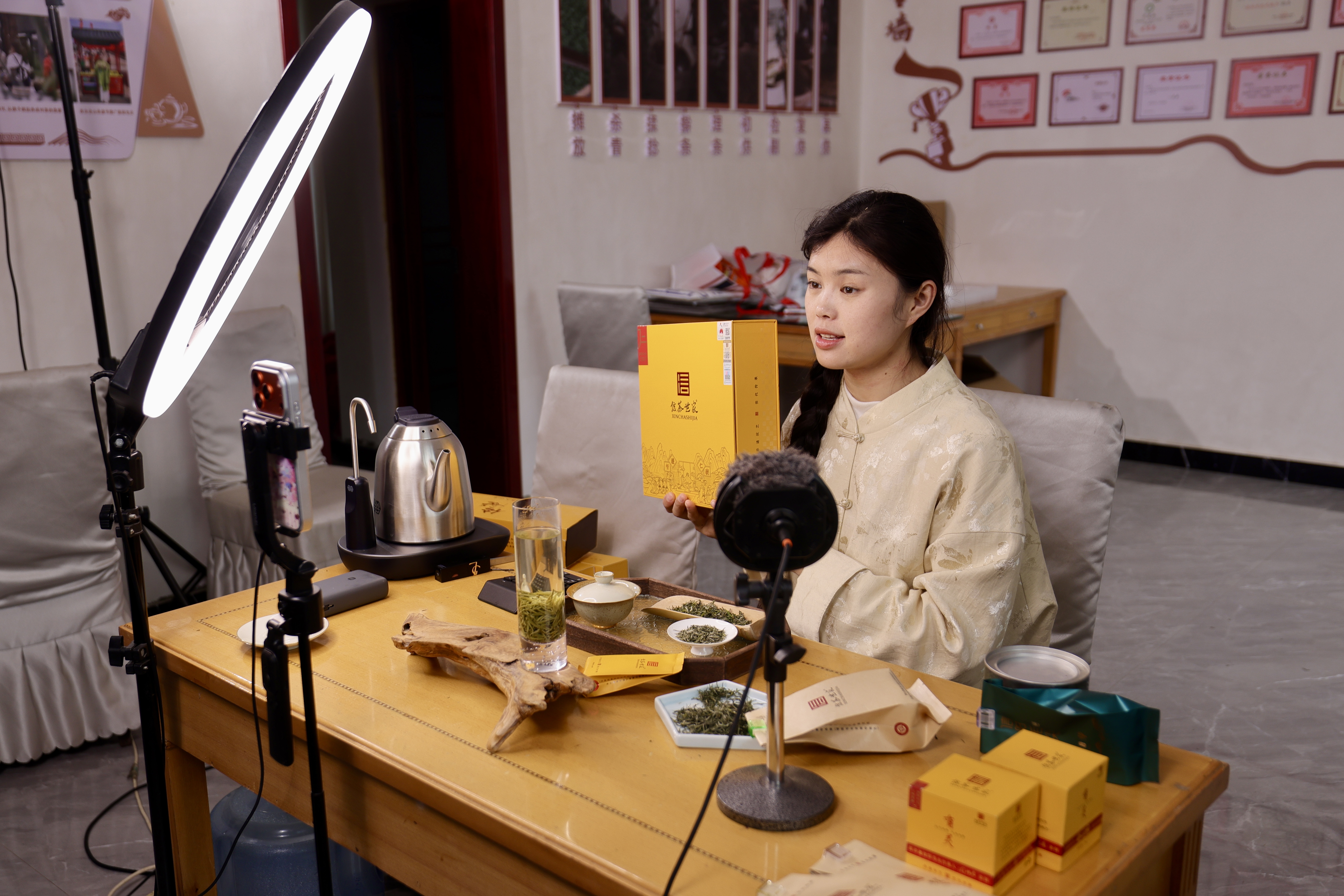 她主动对接农业部门和科研机构,搭建茶叶溯源体系,从茶园管护到采摘炒制,全程可查可验;又把直播间搬进茶山与炒茶车间,对着镜头讲解非遗技艺、展示茶山风光,让深藏大山的信阳毛尖通过网络销往全国各地。