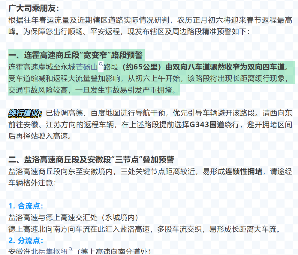 中原高速商丘分公司春节期间发布的返程高峰预警,提及连霍高速商丘段“宽变窄”的问题。