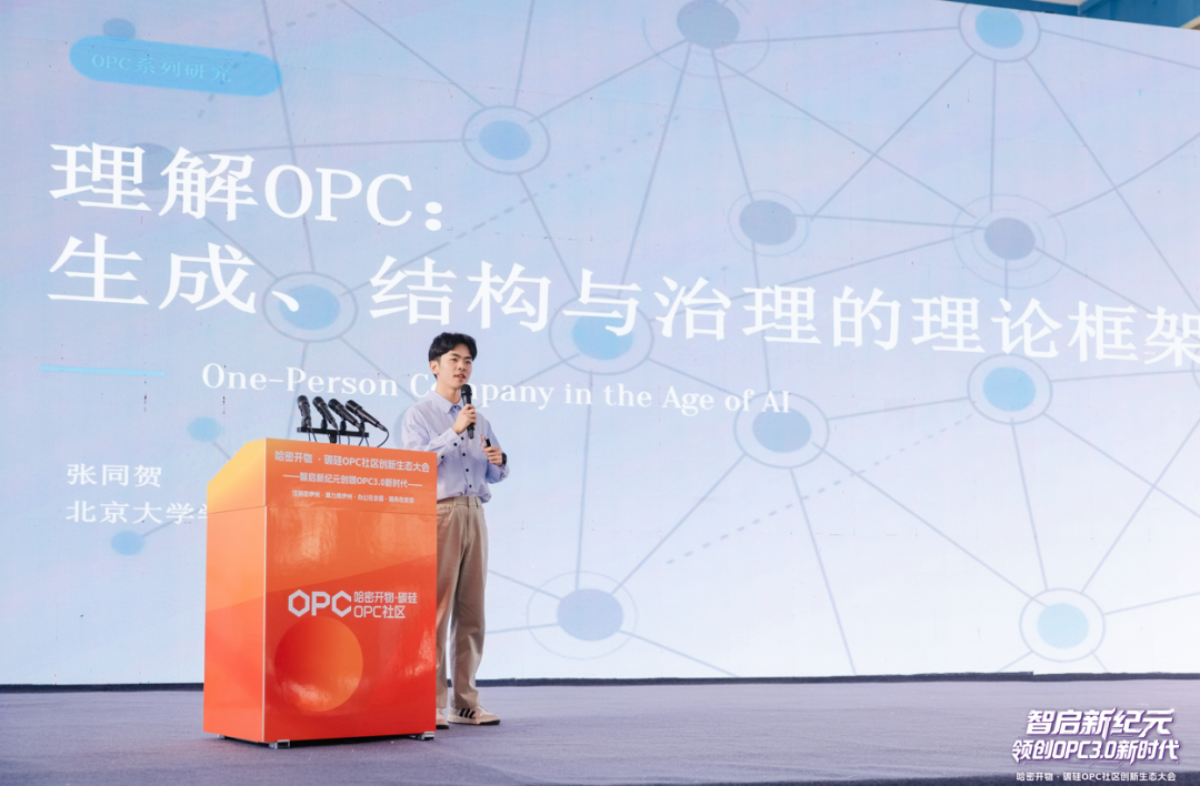 在大会主旨演讲环节,多位行业专家从理论到实践,深入解读了OPC模式。北京大学学生创新学社会长张同贺在《理解OPC:生成、结构与治理的理论框架》演讲中指出,OPC在传统法律框架下是一人有限责任公司,而在AI赋能下已发展为全新理念。他表示:“OPC概念覆盖面广,其中算力资源是关键。哈密拥有非常丰厚的算力优势。创业者可以像数字游民一样,不一定非要在哈密工作,但可以借用哈密的资源,把公司注册在哈密,业务放在全国乃至全球,最终带动整个OPC产业在哈密当地的发展。”