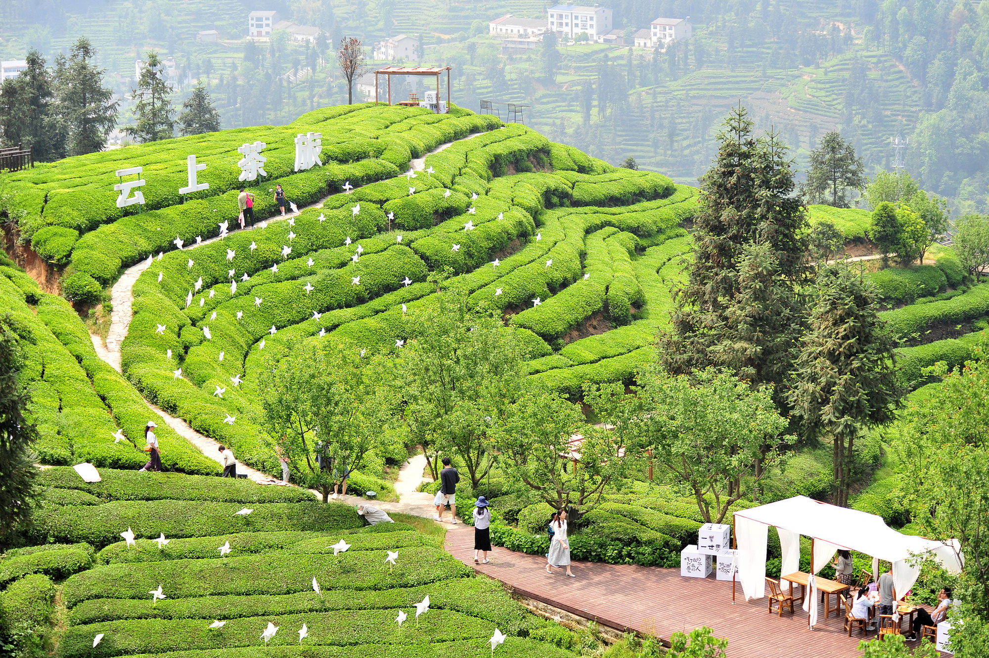 (湖北宜昌,游客“采茶春山上”,在茶垄间观光、采摘)